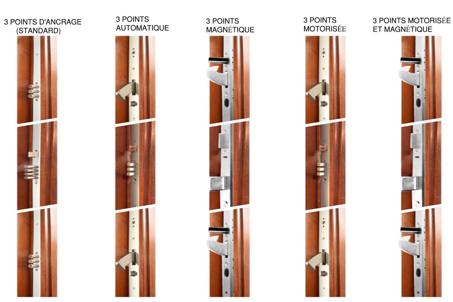 - Serrure 3 points de série : Serrure manuelle avec 10 pênes en acier et 3 points d’ancrage. Celui-ci doit être verrouillé ou déverrouillé manuellement.