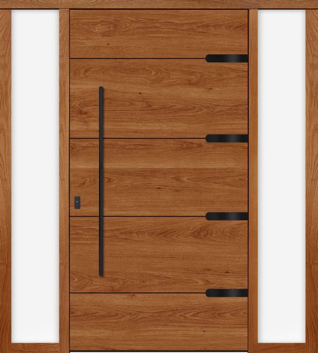 Les luminaires sont conçus comme des éléments indépendants et sont fabriqués dans le même bois et avec la même couleur que la porte, assurant ainsi une parfaite harmonie esthétique.